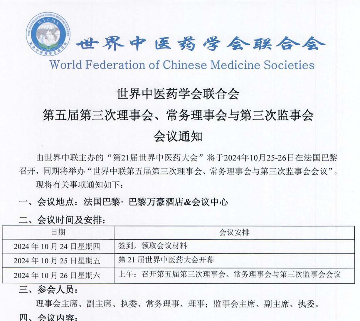 The 21st World Congress of Chinese Medicine, organized by WFCMS, will be held in Paris,…